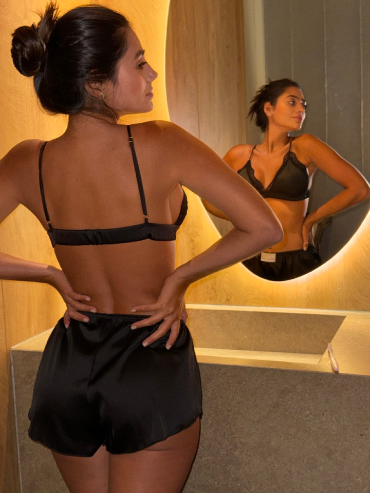Conjunto Dolce Intimate combina elegancia y comodidad en satín suave, diseñado para resaltar tu sensualidad con un toque sofisticado. El top bra triangular sin copa ofrece un ajuste delicado gracias a sus cargaderas ajustables y detalles en los bordes que realzan la feminidad. El short cachetero complementa el look con detalles sutiles que añaden un aire de coquetería. Perfecto para quienes buscan confort sin renunciar a un estilo seductor y refinado.