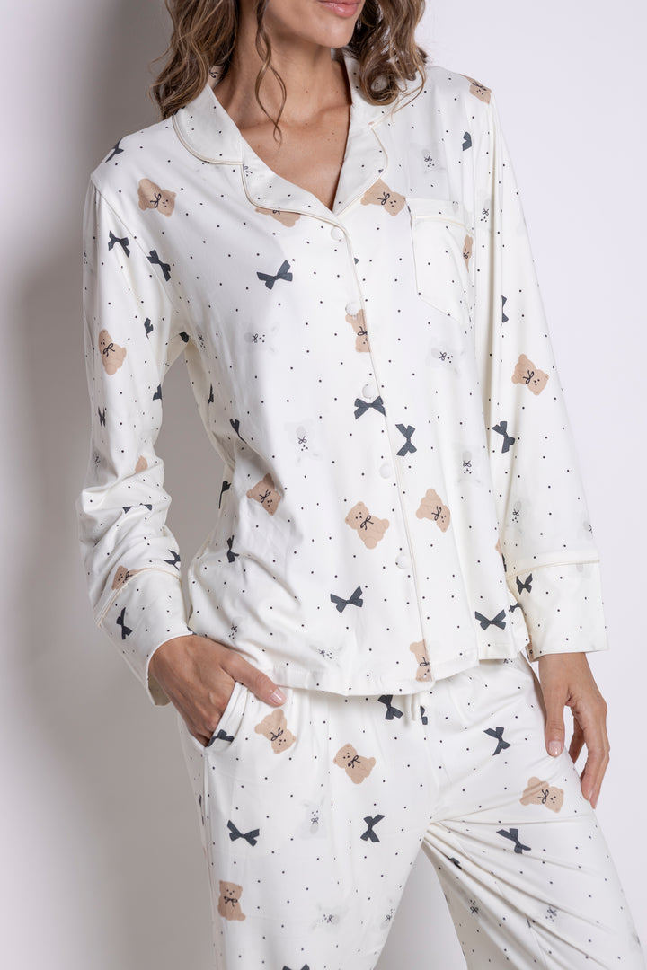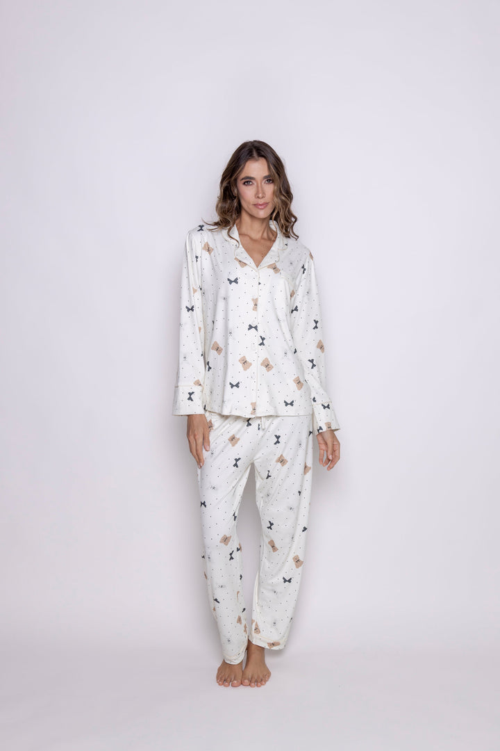 Camisa manga larga con puños, cuello clásico con botones frontales, evocando la estética atemporal del sleepwear refinado. El pantalón, de corte suelto y cintura elástica, garantiza libertad de movimiento y un ajuste cómodo. Un bolsillo lateral discreto añade funcionalidad al diseño.