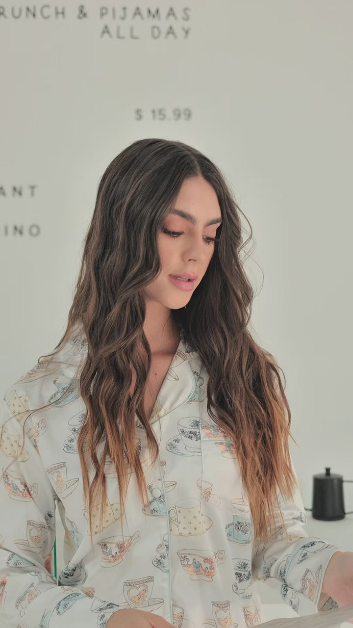 La camisa, de silueta suelta, cuello clásico con botones frontales, evocando la estética atemporal del sleepwear refinado. El pantalón, de corte suelto y cintura elástica, garantiza libertad de movimiento y un ajuste cómodo. Un bolsillo lateral discreto añade funcionalidad al diseño.