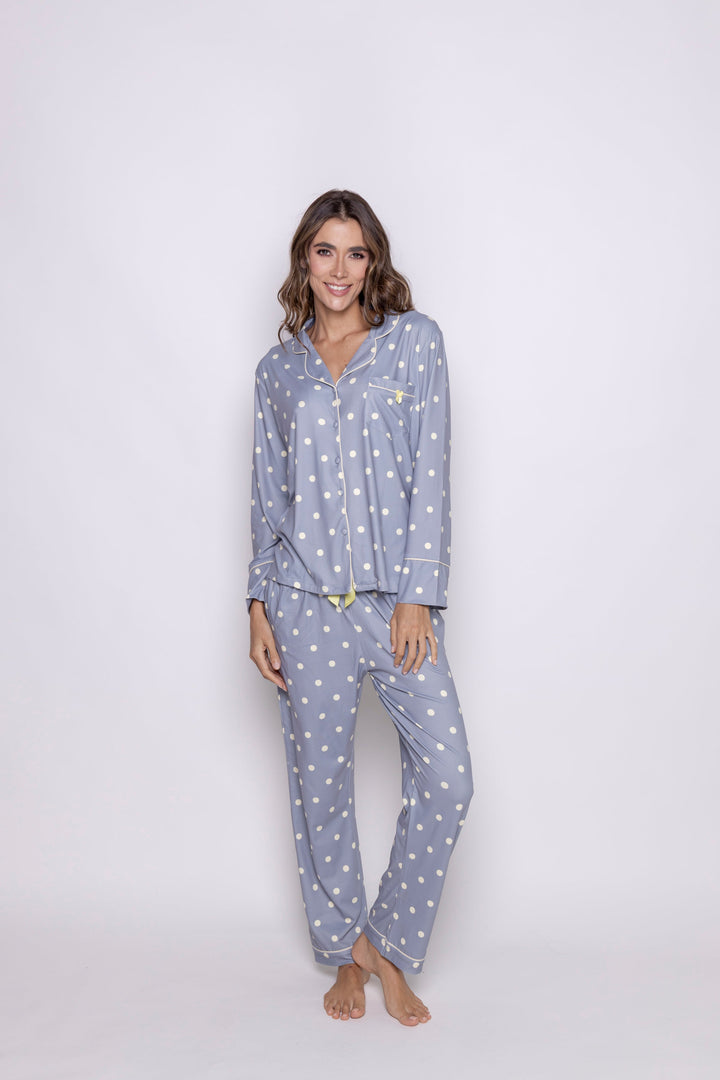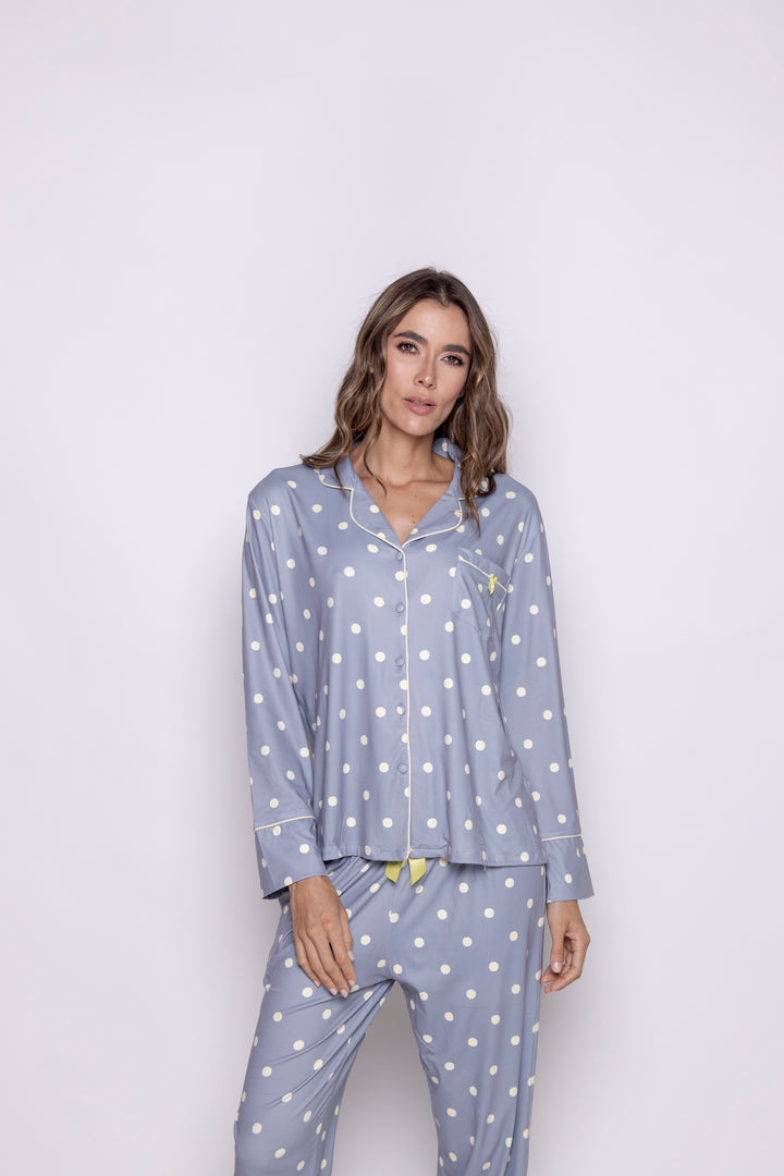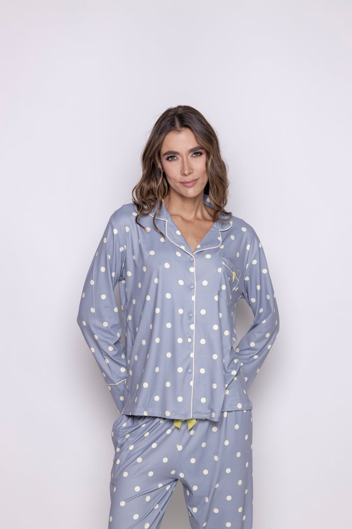 Camisa manga larga con puños, cuello clásico con botones frontales, evocando la estética atemporal del sleepwear refinado. El pantalón, de corte suelto y cintura elástica, garantiza libertad de movimiento y un ajuste cómodo. Un bolsillo lateral discreto añade funcionalidad al diseño.