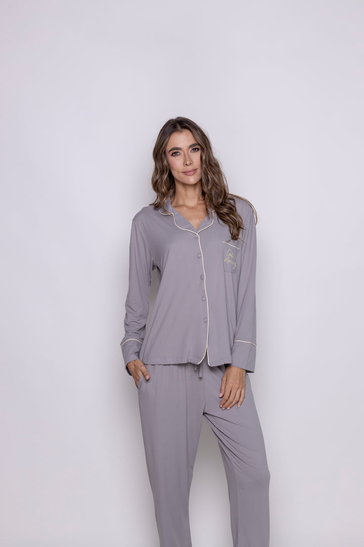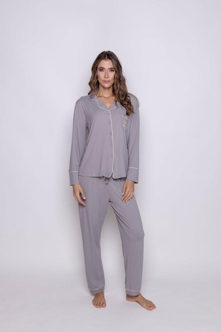 Camisa manga larga con puños, cuello clásico con botones frontales, evocando la estética atemporal del sleepwear refinado. El pantalón, de corte suelto y cintura elástica, garantiza libertad de movimiento y un ajuste cómodo. Un bolsillo lateral discreto añade funcionalidad al diseño.
