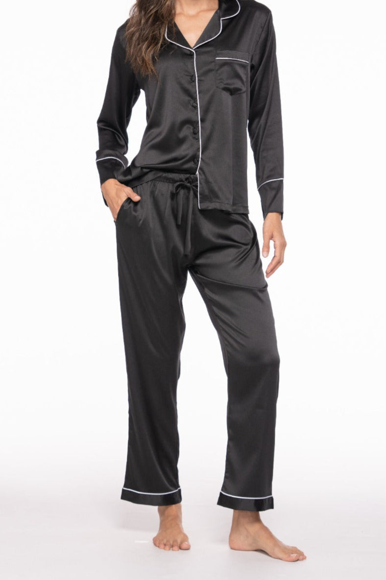 La camisa, de silueta suelta, cuello clásico con botones frontales, evocando la estética atemporal del sleepwear refinado. El pantalón, de corte suelto y cintura elástica, garantiza libertad de movimiento y un ajuste cómodo. Un bolsillo lateral discreto añade funcionalidad al diseño.