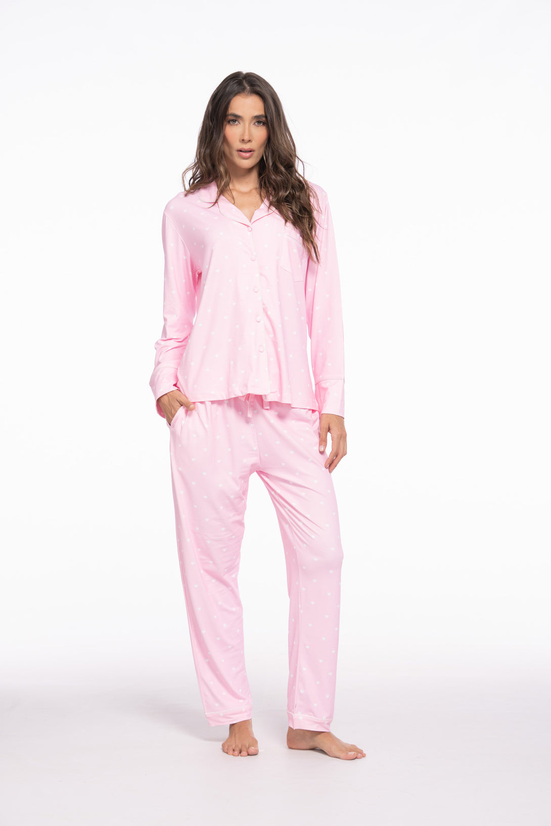 Conjunto de camisa y pantalon elaborados en tejido de punto, una tela suave al tacto, liviana y fresca para dormir, cintura elástica para un ajuste cómodo, cuenta con un bolsillo a un lado. Camisa con cuello y botones, diseñada para una noche de descanso. Disfruta de la comodidad y estilo con este conjunto.