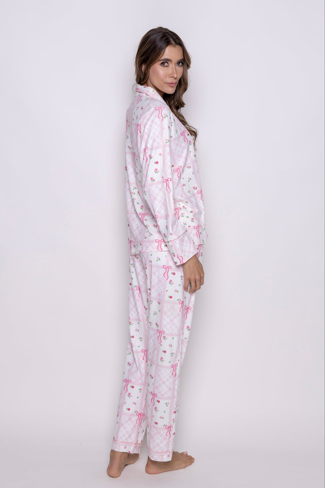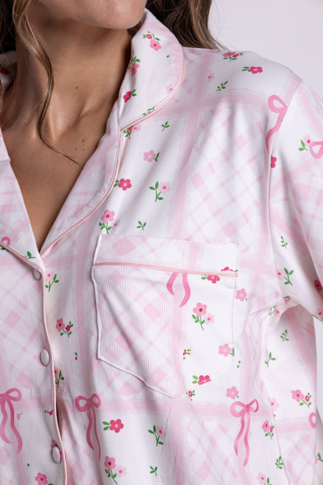 La combinación perfecta entre suavidad y encanto. Confeccionada en tela ligera y cómoda, con un delicado estampado de moños y flores que resalta la feminidad en cada detalle.