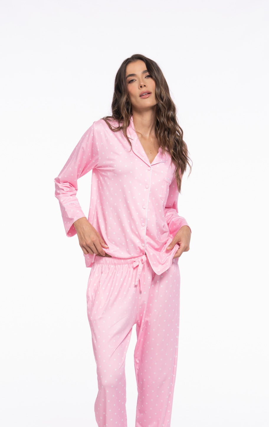 La camisa, de silueta suelta, cuello clásico con botones frontales, evocando la estética atemporal del sleepwear refinado. El pantalón, de corte suelto y cintura elástica, garantiza libertad de movimiento y un ajuste cómodo. Un bolsillo lateral discreto añade funcionalidad al diseño.