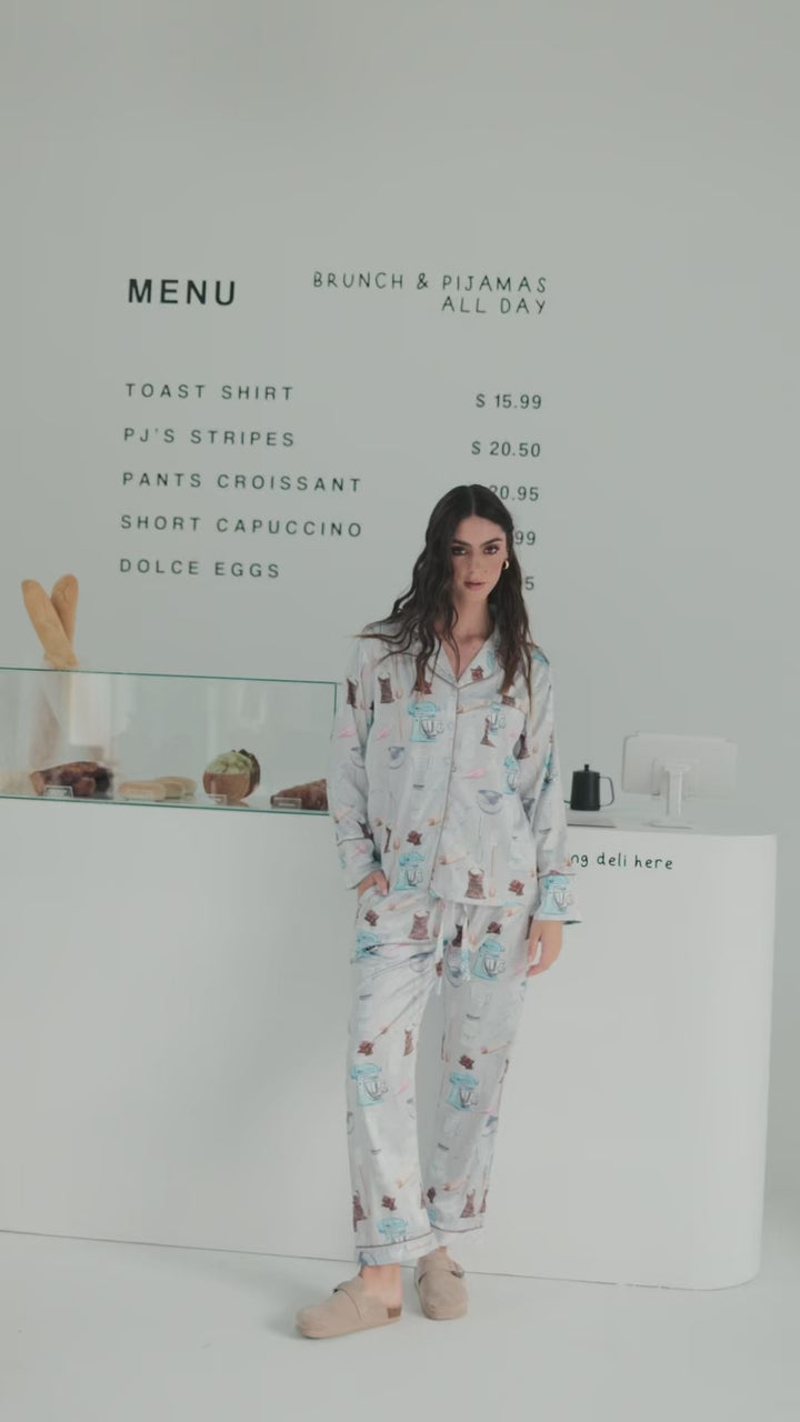 La camisa, de silueta suelta, cuello clásico con botones frontales, evocando la estética atemporal del sleepwear refinado. El pantalón, de corte suelto y cintura elástica, garantiza libertad de movimiento y un ajuste cómodo. Un bolsillo lateral discreto añade funcionalidad al diseño.