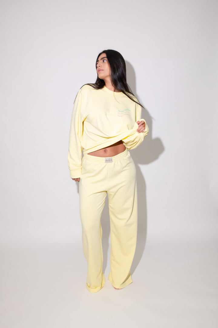 Buso con cuello redondo, delicado bordado de la colección bye bye summer. El pantalón, de corte suelto y cintura elástica, garantiza libertad de movimiento y un ajuste cómodo.