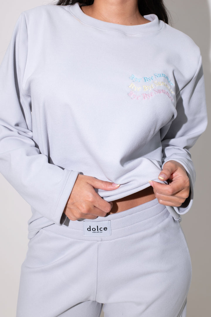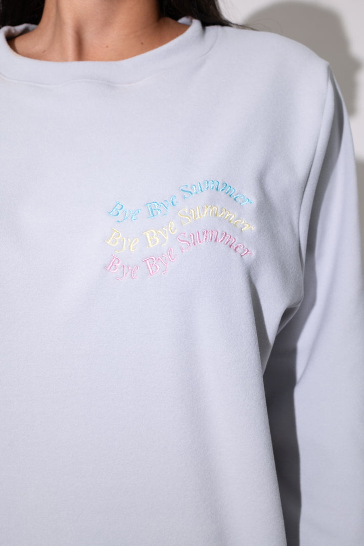 Buso con cuello redondo, delicado bordado de la colección bye bye summer. El pantalón, de corte suelto y cintura elástica, garantiza libertad de movimiento y un ajuste cómodo.
