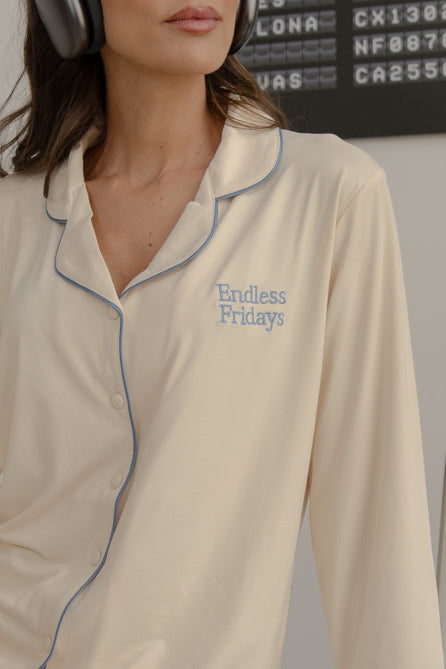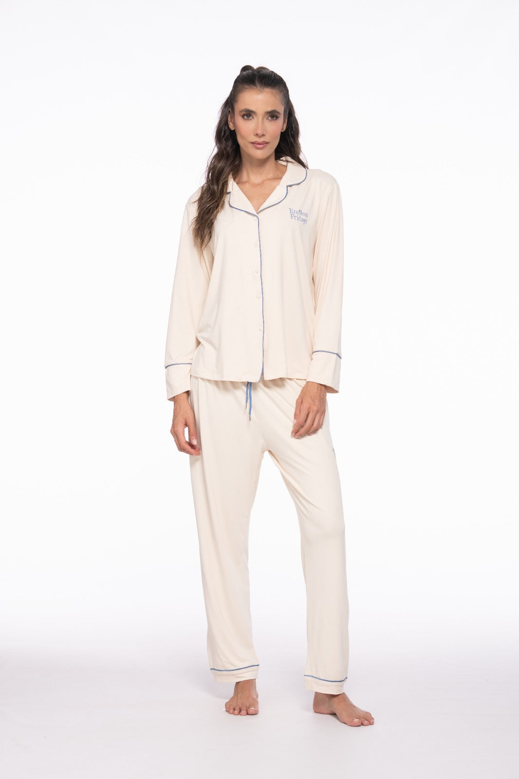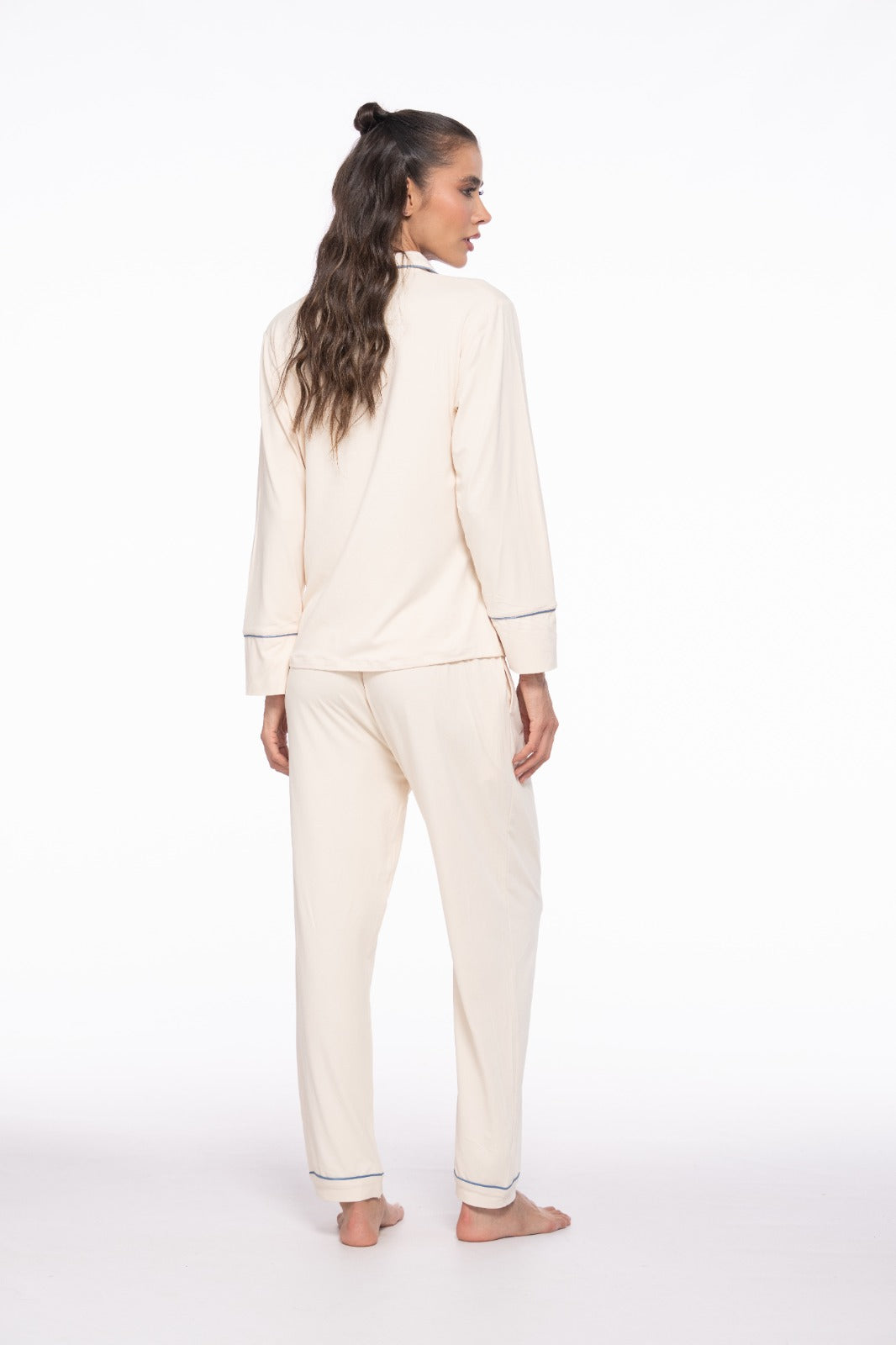 La camisa, de silueta suelta, cuello clásico con botones frontales, evocando la estética atemporal del sleepwear refinado. El pantalón, de corte suelto y cintura elástica, garantiza libertad de movimiento y un ajuste cómodo. Un bolsillo lateral discreto añade funcionalidad al diseño.