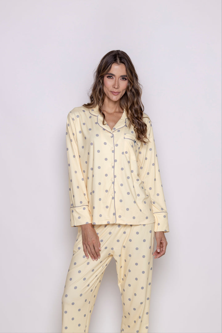 Camisa manga larga con puños, cuello clásico con botones frontales, evocando la estética atemporal del sleepwear refinado. El pantalón, de corte suelto y cintura elástica, garantiza libertad de movimiento y un ajuste cómodo. Un bolsillo lateral discreto añade funcionalidad al diseño.