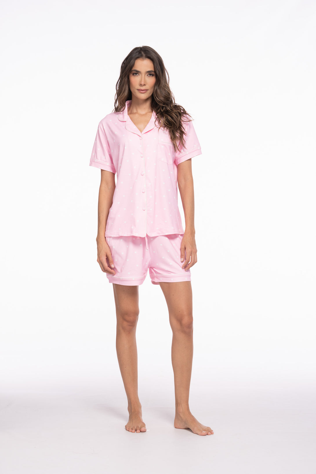 Conjunto de camisa y short elaborados en tejido de punto, una tela suave al tacto, liviana y fresca para dormir, cintura elástica para un ajuste cómodo, cuenta con un bolsillo a un lado. Camisa con cuello y botones, diseñada para una noche de descanso. Disfruta de la comodidad y estilo con este conjunto.