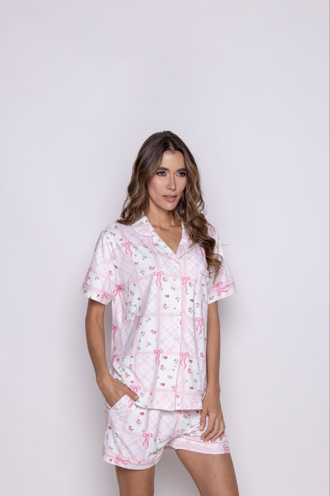 La combinación perfecta entre suavidad y encanto. Confeccionada en tela ligera y cómoda, con un delicado estampado de moños y flores que resalta la feminidad en cada detalle.