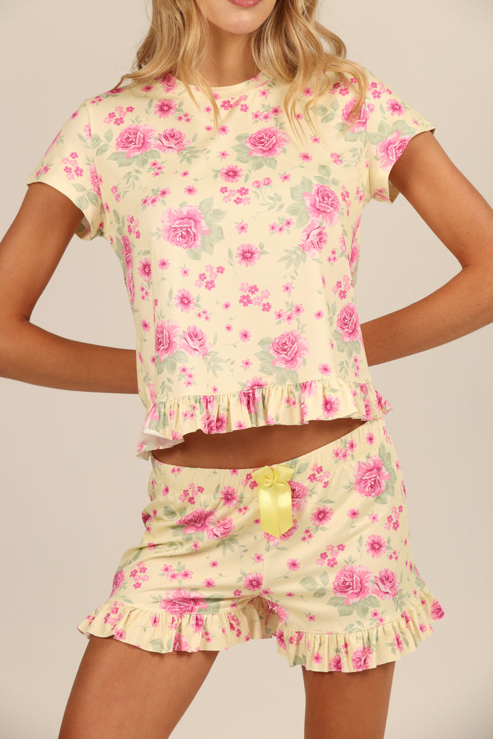 Conjunto de pijama, short y camiseta con tela suave y elástica este conjunto se adaptará perfectamente a tu cuerpo y te mantendrá cómoda toda la noche. Detalles en los ruedos con bolero sutil que resalta la ternura de esta prenda.