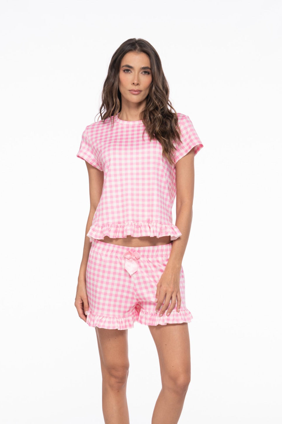 Conjunto de pijama, short y camiseta con tela suave y elástica este conjunto se adaptará perfectamente a tu cuerpo y te mantendrá cómoda toda la noche. Detalles en los ruedos con bolero sutil que resalta la ternura de esta prenda, ya sea que estés descansando en casa o preparándote para una buena noche de sueño, te sentirás elegante y relajada con el encantador estampado de última colección.