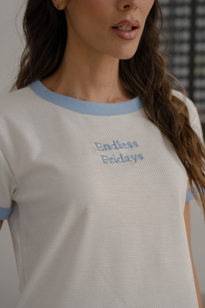 Bordado frontal “Endless Friday” en hilo tono sobre tono con acabado profesional.